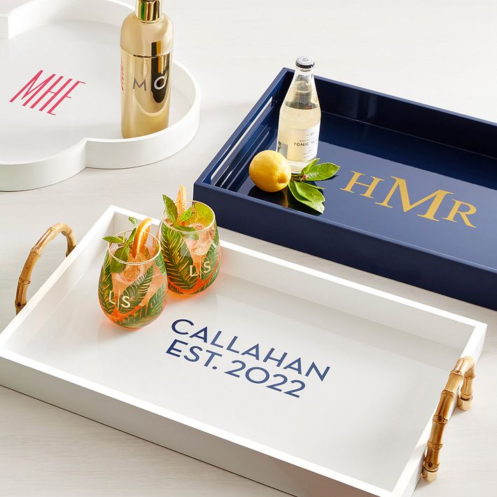 Crafted from responsibly sourced wood with a high-gloss lacquered finish, this stylish tray features arched bamboo handles for a classic touch of texture. Perfect for coffee tables, credenzas and dresser tops, it combines fashion and function beautifully. Add a custom monogram for a personal touch.