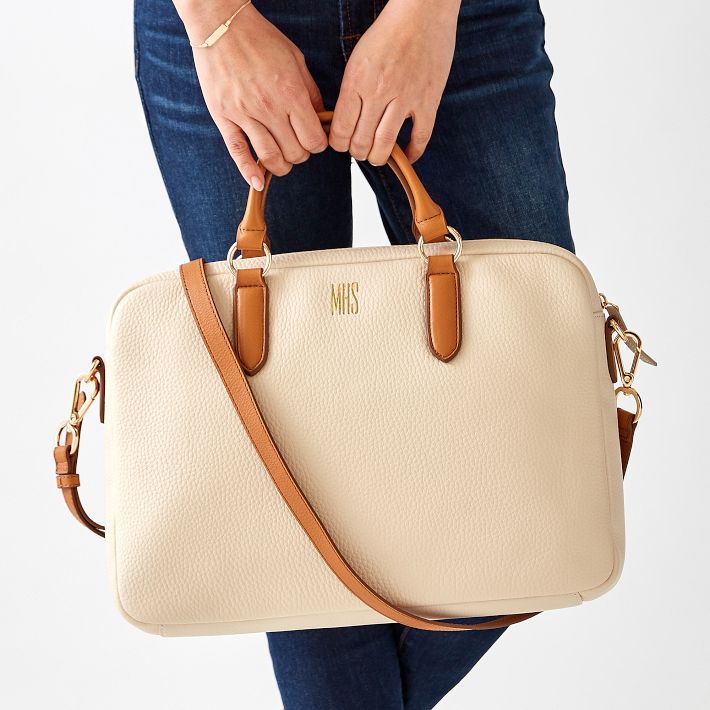 Give your work bag a promotion with this ultra-functional and stylish laptop bag. A modern take on the usual briefcase, this slim crossbody is the perfect way to transport your laptop with a padded sleeve that fits up to a 14” laptop and an adjustable crossbody strap for your commute. Made from pebbled leather with carry handles and a soft linen lining, the crossbody is perfect for your 9-5 essentials with multiple pockets and extra room for a tablet and notebook inside.