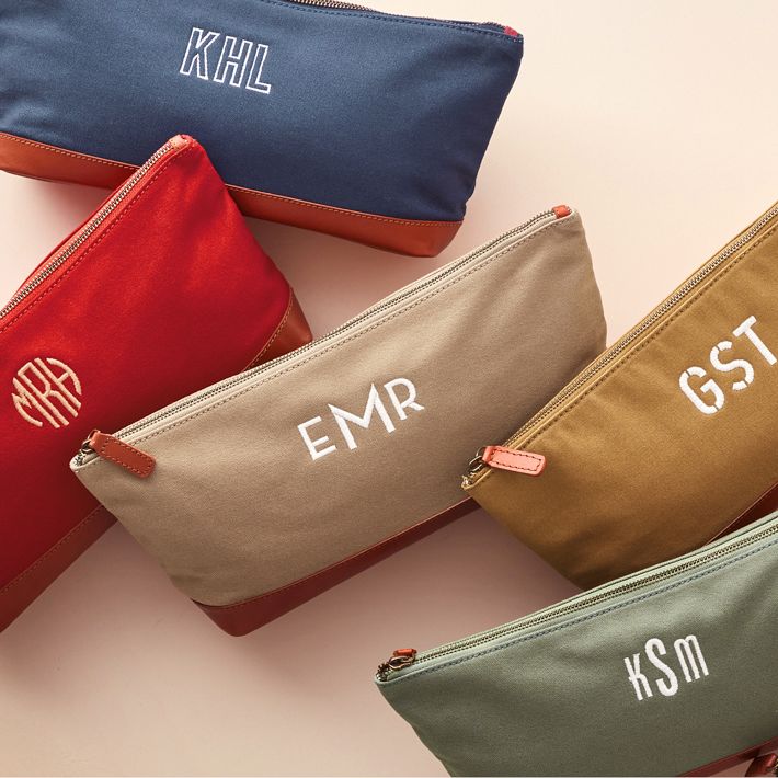 The perfect pouch for all your travel essentials. Crafted from durable canvas with leather details, it features a zippered closure and an embroidered monogram.