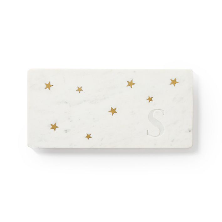 Beautiful white marble is embellished with gold stars in this stylish cheese board. Perfect for charcuterie displays, this serving essential also makes for lovely kitchen decor between get-togethers. Add your monogram to make this statement piece truly shine.