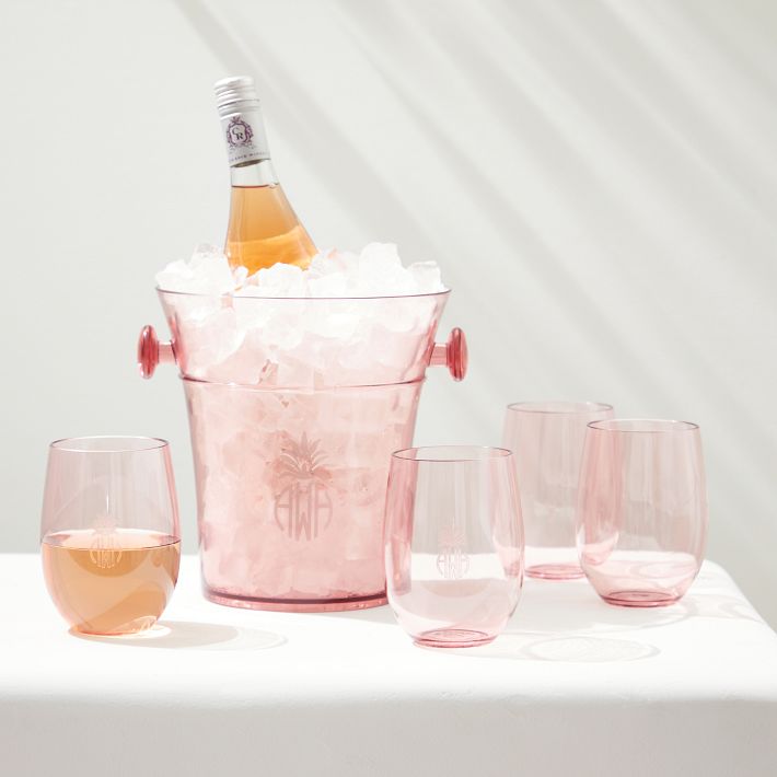 Perfect for casual entertaining and durable enough for everyday use, this beautiful set includes an ice bucket and four stemless wine glasses made from dishwasher safe and BPA free shatter-proof acrylic. The transparent ice bucket is perfect for presenting your favorite bottle of wine and the stemless wine glasses have a low center of gravity which makes them ideal for avoiding accidental spills, especially on uneven surfaces such as grass. Add a laser engraved monogram and gift this set to the host or hostess.