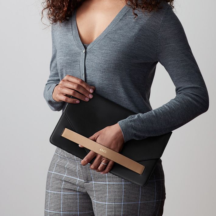 Perfectly polished. This envelope clutch is beautifully crafted from luxuriously smooth leather that features a modern colorblock design. The envelope closure slides into a contrasting leather band thoughtfully designed to both secure the opening and to slide your hand through for extra support. Carry your must-haves for a night out in the main section and slip your phone or keys in the back magnetic pocket for easy access.