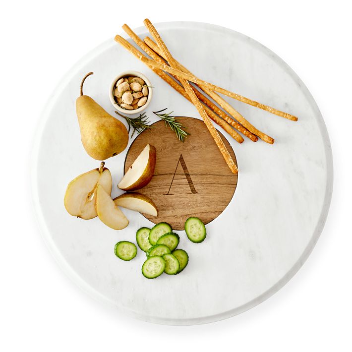 This beautiful lazy Susan is everything effortless entertaining should be. Handcrafted from polished white marble and solid acacia wood, the simple rotating design makes serving and sharing food as easy as a smooth spin. The polished marble adds a sophisticated elegance to any table setting. Each piece is unique due to the natural variations that occur in the marble and wood. Engrave a monogram on this beautiful piece for the perfect wedding, engagement, or housewarming gift.