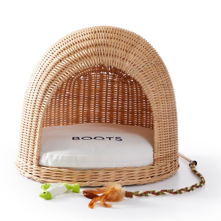A stylish nap spot for your cat or small dog. Beautifully woven from durable rattan into a cozy dome shape, this pet house features a plush pillow bed that can be personalized with their name. Give as a gift to the animal lover in your life or to your own furry friends.