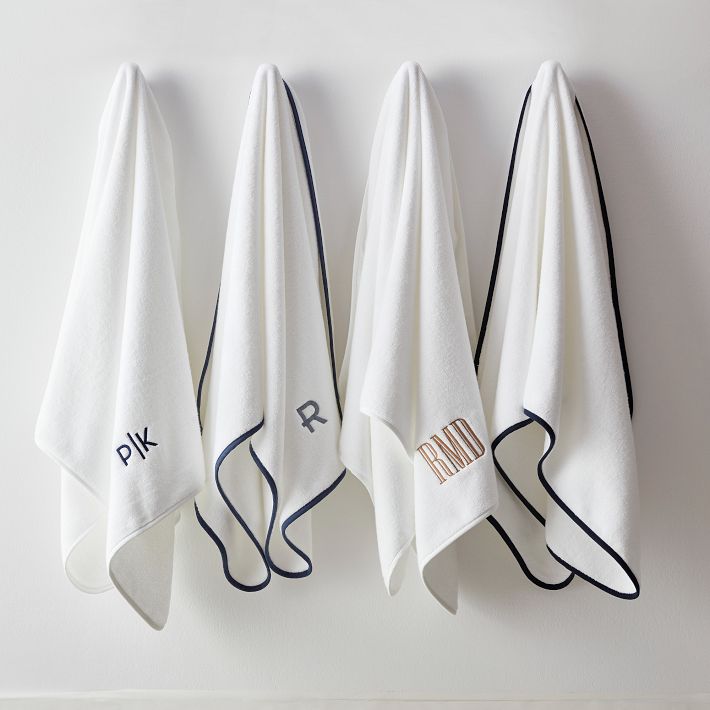Indulge in cloud-like comfort with our new plush bath towels. Woven from thousands of fine, untwisted loops, our Turkish Hydrocotton is lighter, softer, and up to ten times more absorbent than traditional cotton terry. This 600-gram weight bath towel is finished with rounded edges and a single piped band of crisp white or contrasting navy. Add your monogram for a luxe upgrade to your everyday essentials.