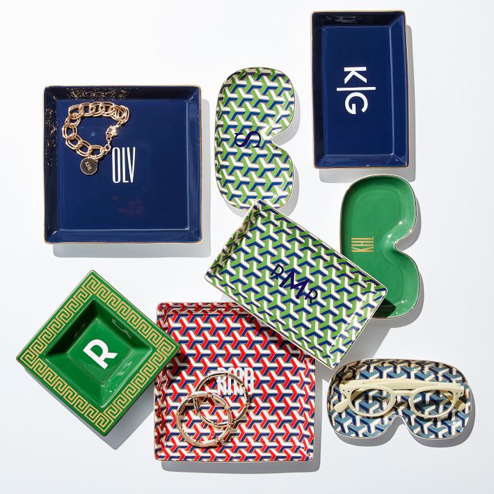 Elegant organization at its finest, our latest collection of square and rectangle ceramic catchall trays are crafted from ceramic porcelain and feature a hand painted gold rim with graphic patterns and designs that feature decal monogramming.