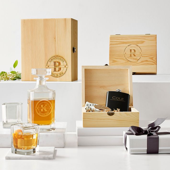 The ultimate gift box for the connoisseur in your life, this wooden box features an engraved lid that opens to reveal a lead-free glass decanter and two whiskey glasses. Add an engraved name to the box and decanter for the perfect personal touch on this go-to gift.