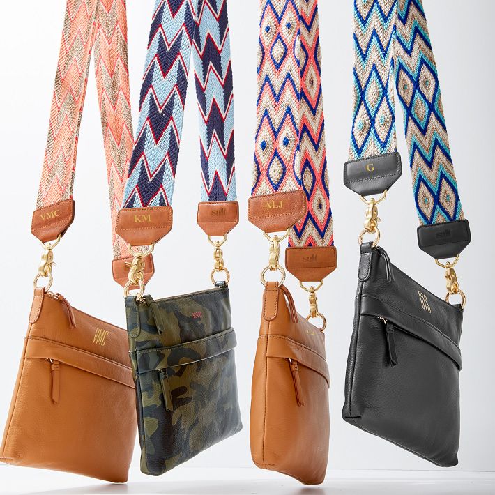 Designed in collaboration with Salt, our new bag straps are artfully handwoven in fresh, vibrant patterns by Fair Trade Colombian Wayúu artisans. Woven from cotton and finished with natural vegetable-tanned leather and solid brass clips, these bag straps pair perfectly with your favorite bags and totes and can be personalized with a classic foil monogram.