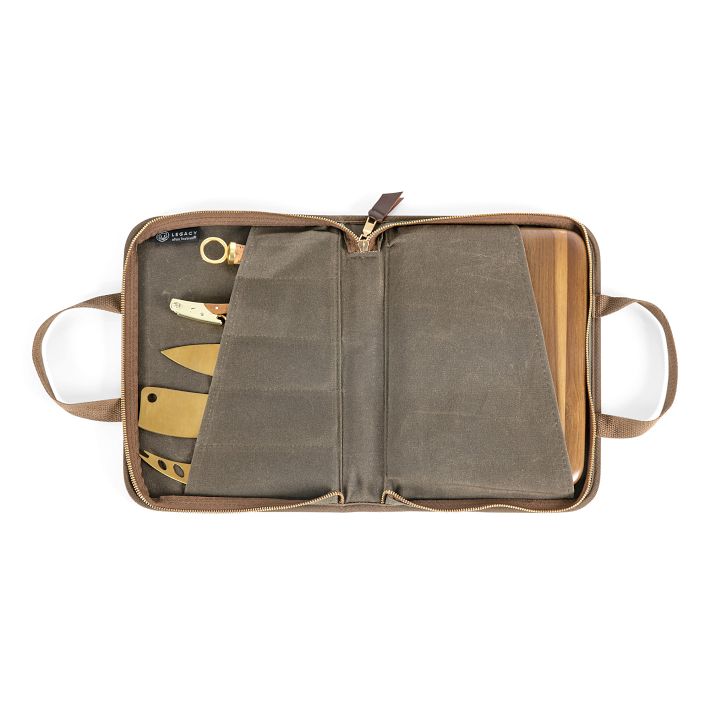 • Waxed canvas case, stainless steel tools, acacia wood board.
